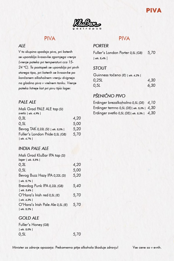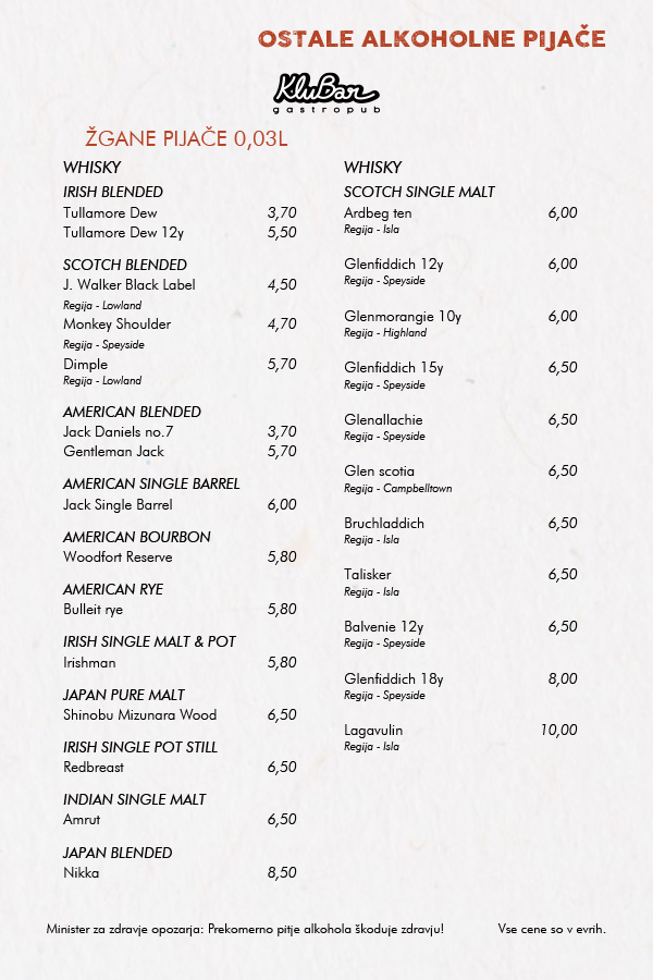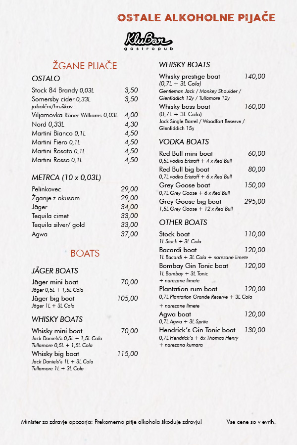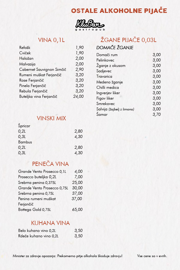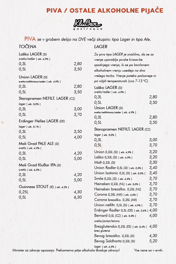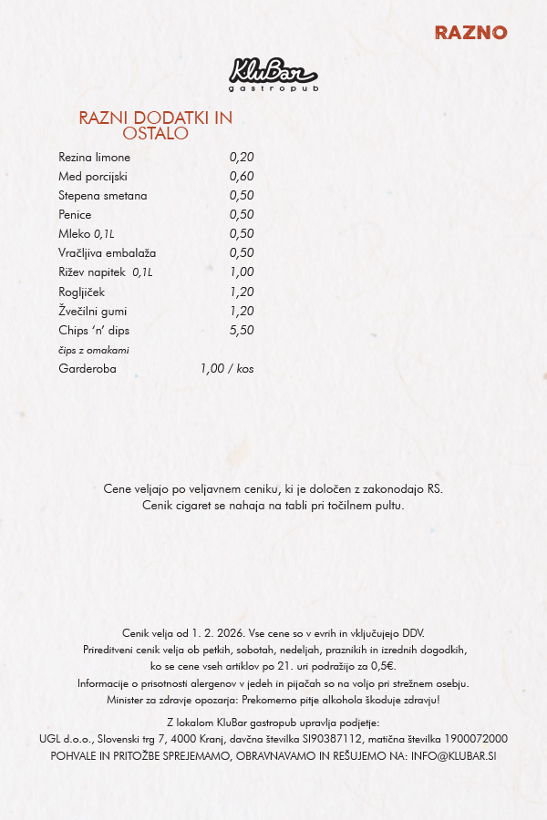 OB PETKIH, SOBOTAH, NEDELJAH IN OB IZREDNIH DOGODKIH SE OD 21. URE CENE PODRAŽIJO ZA 0,5€!